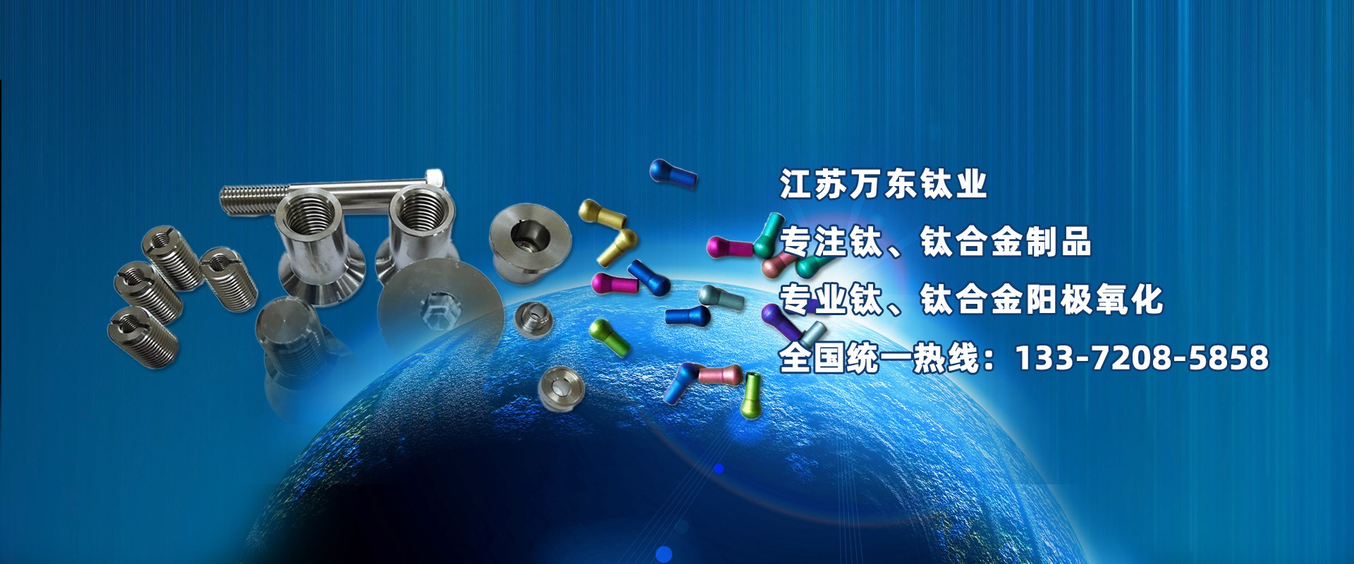 江蘇萬東鈦業(yè)科技有限公司坐落于中國江蘇省南通市,擁有28年的鈦合金研發(fā)技術,公司專業(yè)從事:鈦陽極氧化、鈦合金陽極氧化、脈沖氧化。鈦合金緊固件生產:M0.6以上高品質:螺絲、螺母、螺柱、螺套、可根據(jù)用戶的特殊要求定制。